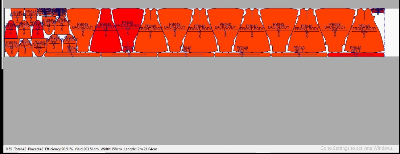 Pada contoh ini marker penggunaan bahan kain yang paling efisien dengan menggunakan 6 gambar pola (ukuran: XS, S, M, L, XL, 2XL) adalah 468cm dengan tingkat efisiensi sebesar 87.96%.