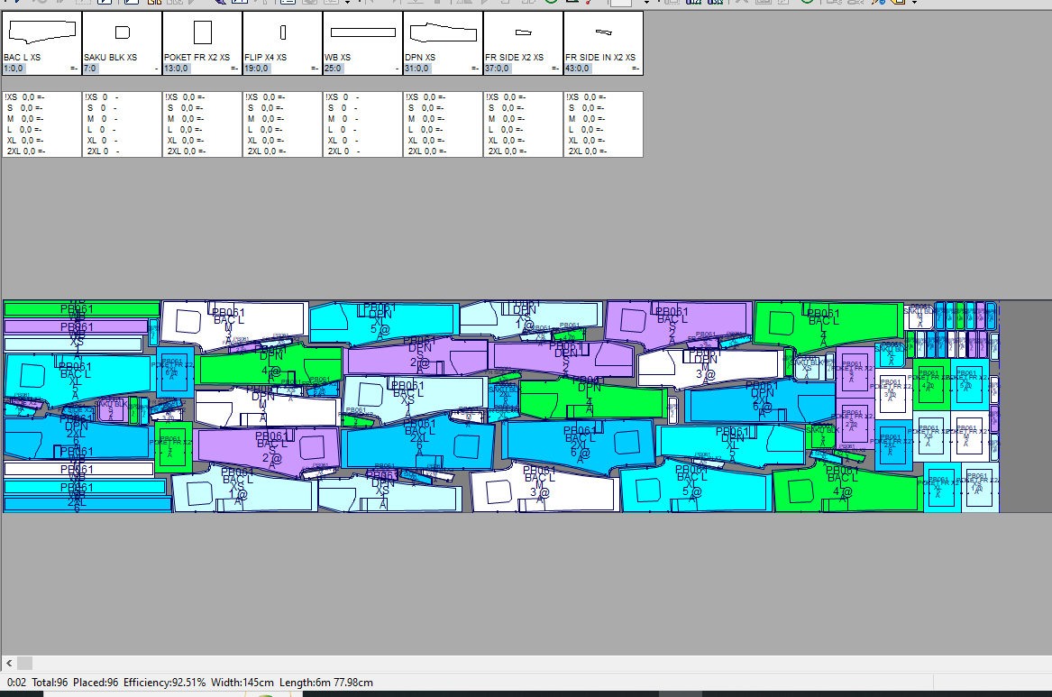 1. Markeran bahan dihasilkan secara otomatis menggunakan algoritma otomatis mengikuti standar industri Internasional untuk mendapatkan penggunaan kain yang paling efisien dengan analisa lebih dari 10,000 markeran pola