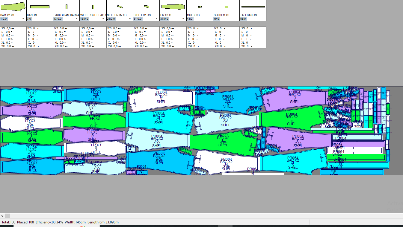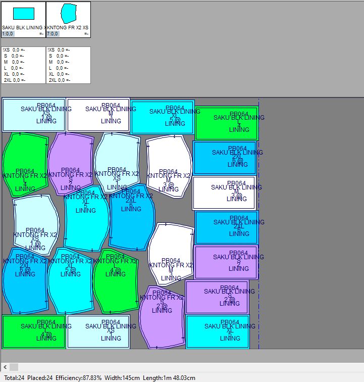 Pada contoh ini marker penggunaan bahan kain yang paling efisien dengan menggunakan 6 gambar pola (ukuran: XS, S, M, L, XL, 2XL) adalah 468cm dengan tingkat efisiensi sebesar 87.96%.