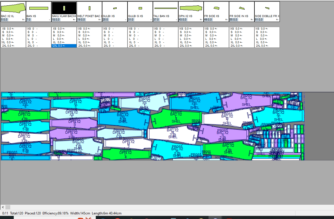 Pada contoh ini marker penggunaan bahan kain yang paling efisien dengan menggunakan 6 gambar pola (ukuran: XS, S, M, L, XL, 2XL) adalah 468cm dengan tingkat efisiensi sebesar 87.96%.