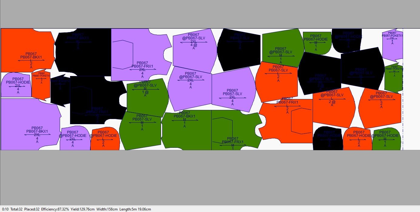 1. Markeran bahan dihasilkan secara otomatis menggunakan algoritma otomatis mengikuti standar industri Internasional untuk mendapatkan penggunaan kain yang paling efisien dengan analisa lebih dari 10,000 markeran pola
