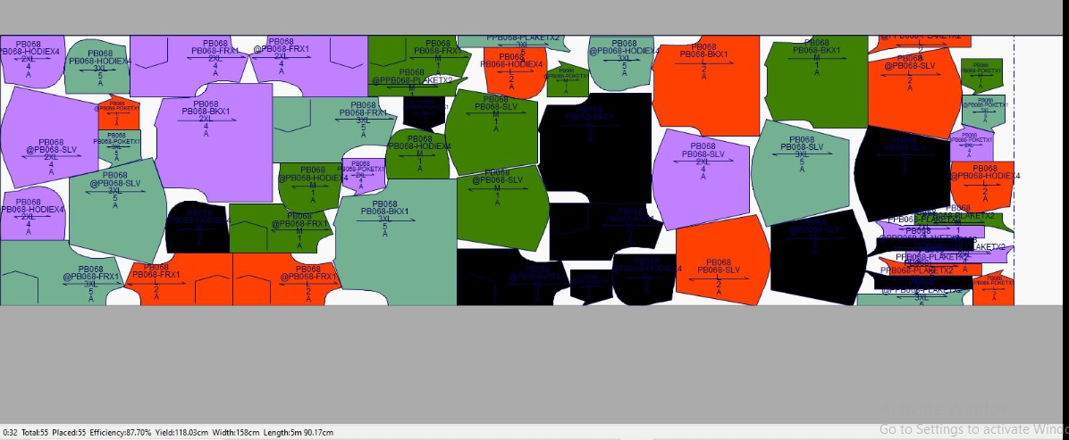 Pada contoh ini marker penggunaan bahan kain yang paling efisien dengan menggunakan 6 gambar pola (ukuran: XS, S, M, L, XL, 2XL) adalah 468cm dengan tingkat efisiensi sebesar 87.96%.