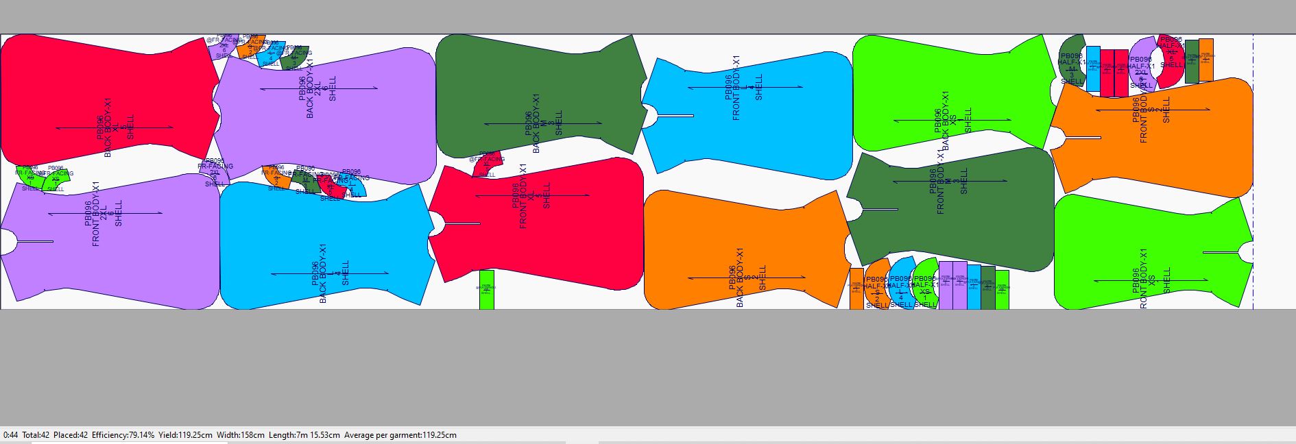 Pada contoh ini marker penggunaan bahan kain yang paling efisien dengan menggunakan 6 gambar pola (ukuran: XS, S, M, L, XL, 2XL) adalah 468cm dengan tingkat efisiensi sebesar 87.96%.