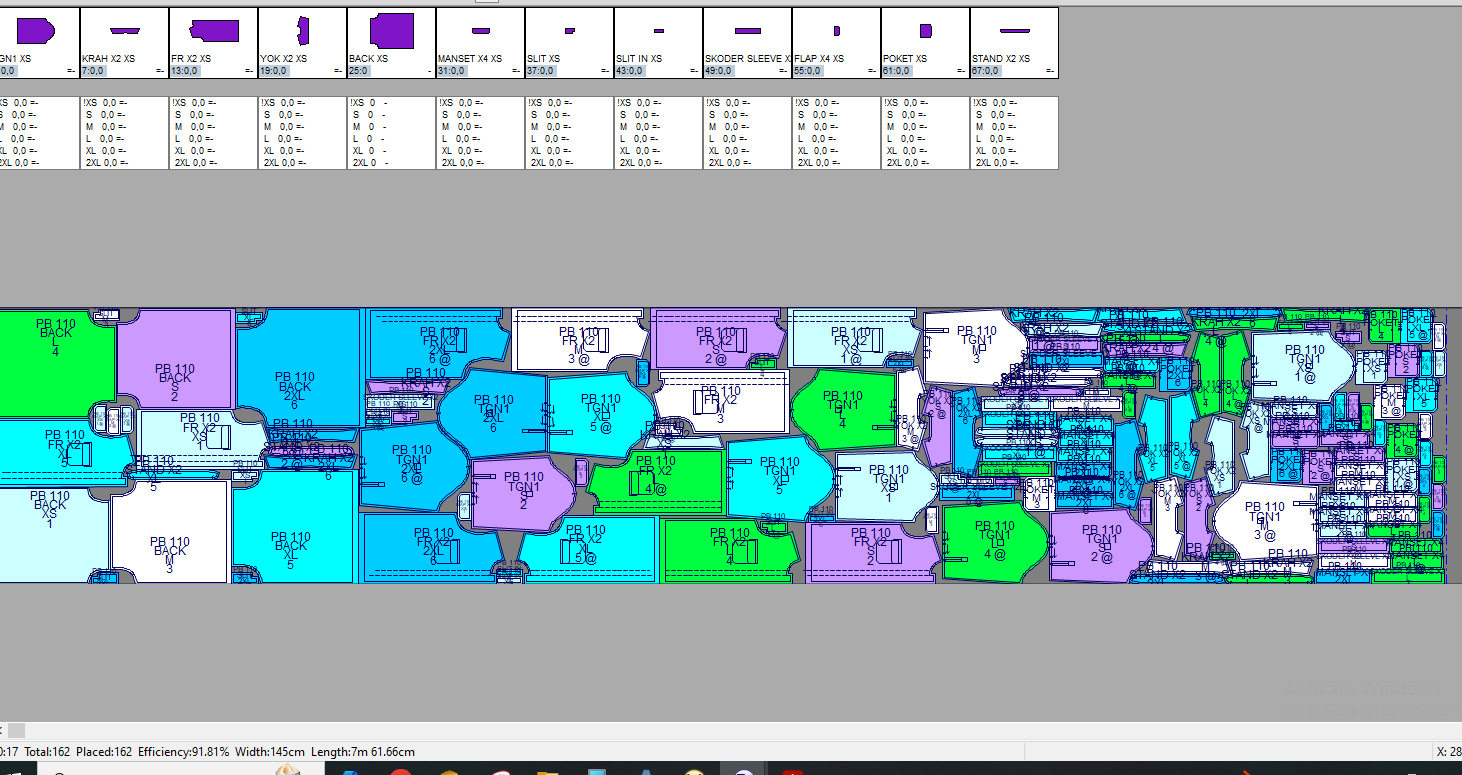 1. Markeran bahan dihasilkan secara otomatis menggunakan algoritma otomatis mengikuti standar industri Internasional untuk mendapatkan penggunaan kain yang paling efisien dengan analisa lebih dari 10,000 markeran pola