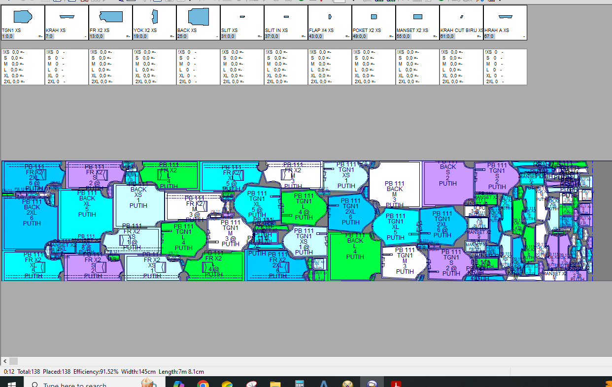Pada contoh ini marker penggunaan bahan kain yang paling efisien dengan menggunakan 6 gambar pola (ukuran: XS, S, M, L, XL, 2XL) adalah 468cm dengan tingkat efisiensi sebesar 87.96%.