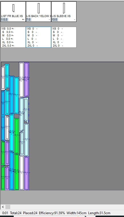 Pada contoh ini marker penggunaan bahan kain yang paling efisien dengan menggunakan 6 gambar pola (ukuran: XS, S, M, L, XL, 2XL) adalah 468cm dengan tingkat efisiensi sebesar 87.96%.