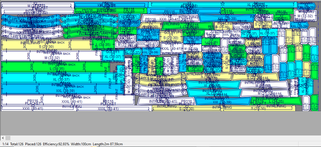 1. Markeran bahan dihasilkan secara otomatis menggunakan algoritma otomatis mengikuti standar industri Internasional untuk mendapatkan penggunaan kain yang paling efisien dengan analisa lebih dari 10,000 markeran pola