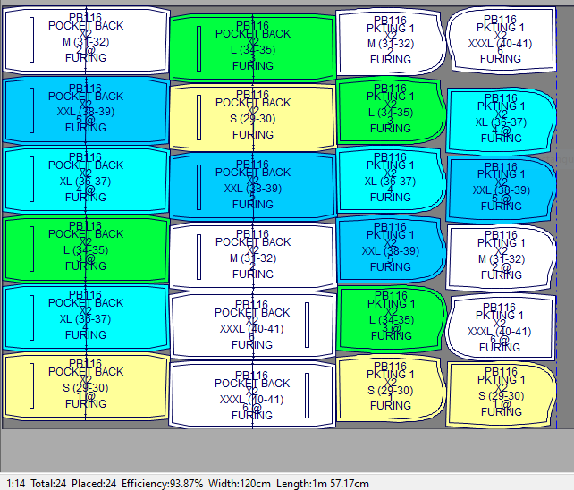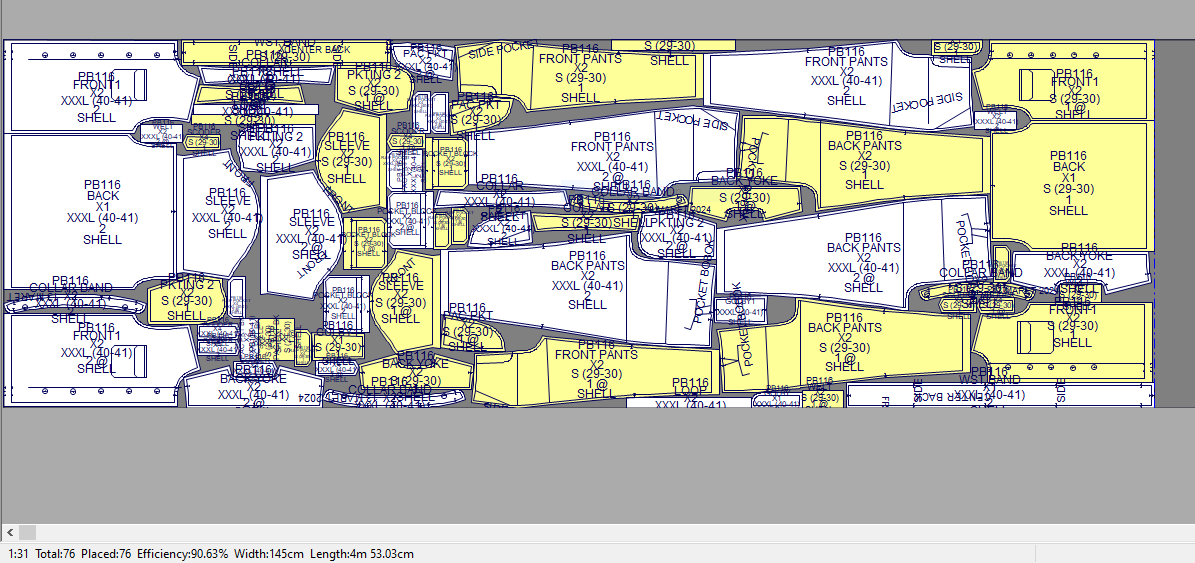Pada contoh ini marker penggunaan bahan kain yang paling efisien dengan menggunakan 6 gambar pola (ukuran: XS, S, M, L, XL, 2XL) adalah 468cm dengan tingkat efisiensi sebesar 87.96%.