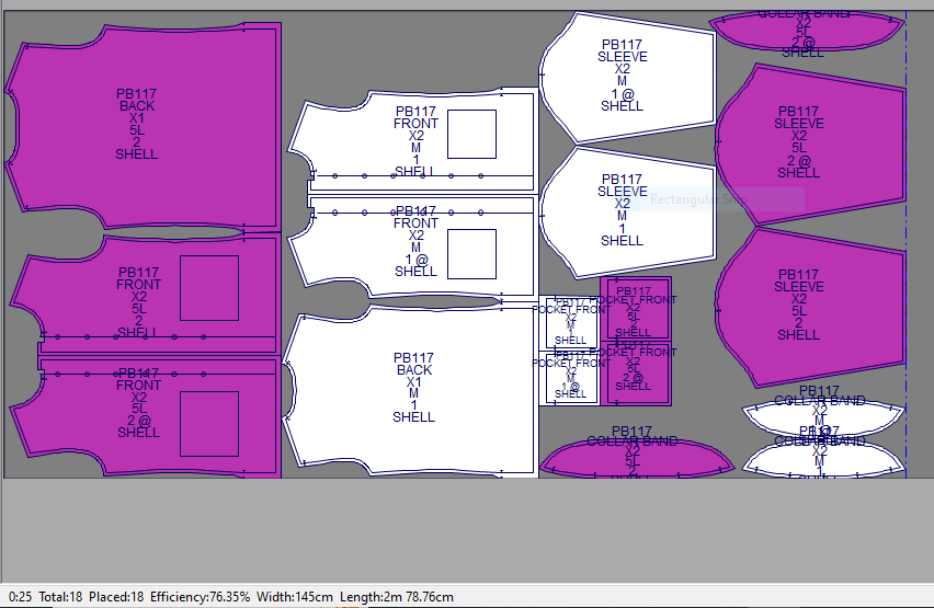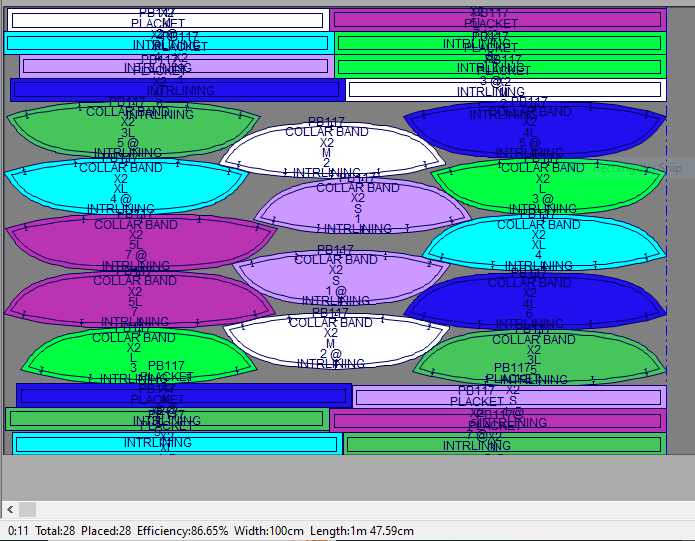 Pada contoh ini marker penggunaan bahan kain yang paling efisien dengan menggunakan 6 gambar pola (ukuran: XS, S, M, L, XL, 2XL) adalah 468cm dengan tingkat efisiensi sebesar 87.96%.