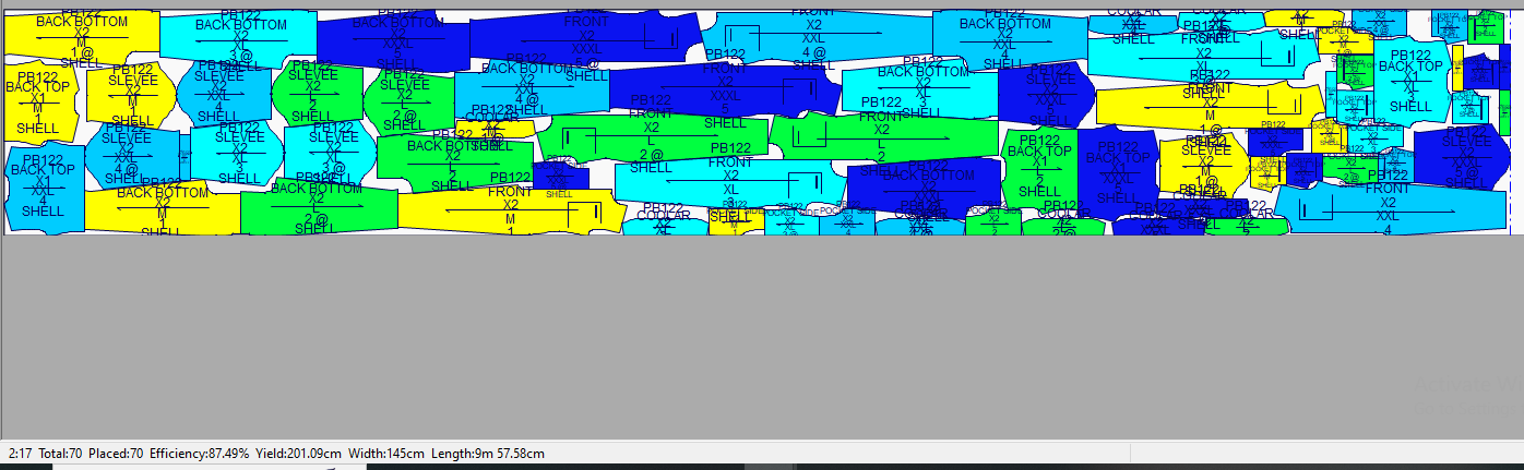 Pada contoh ini marker penggunaan bahan kain yang paling efisien dengan menggunakan 6 gambar pola (ukuran: XS, S, M, L, XL, 2XL) adalah 468cm dengan tingkat efisiensi sebesar 87.96%.