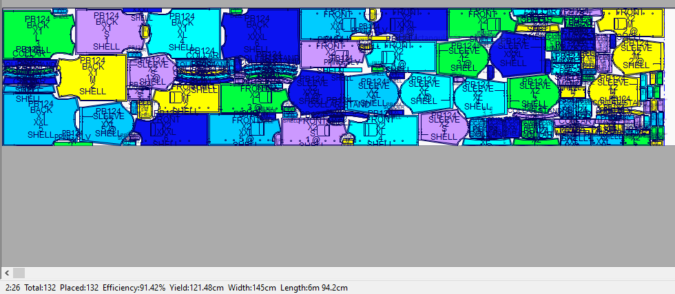 Pada contoh ini marker penggunaan bahan kain yang paling efisien dengan menggunakan 6 gambar pola (ukuran: XS, S, M, L, XL, 2XL) adalah 468cm dengan tingkat efisiensi sebesar 87.96%.