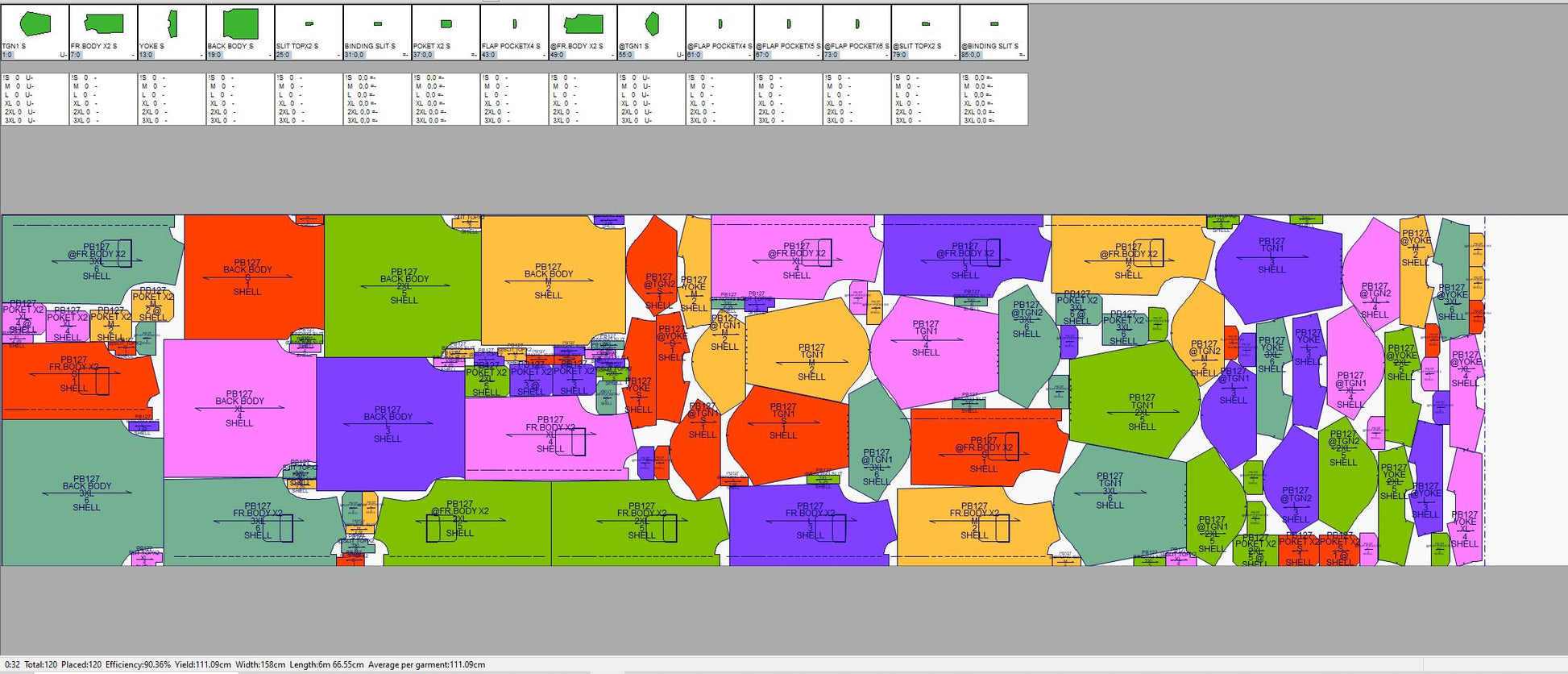 Pada contoh ini marker penggunaan bahan kain yang paling efisien dengan menggunakan 6 gambar pola (ukuran: XS, S, M, L, XL, 2XL) adalah 468cm dengan tingkat efisiensi sebesar 87.96%.