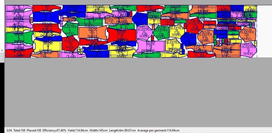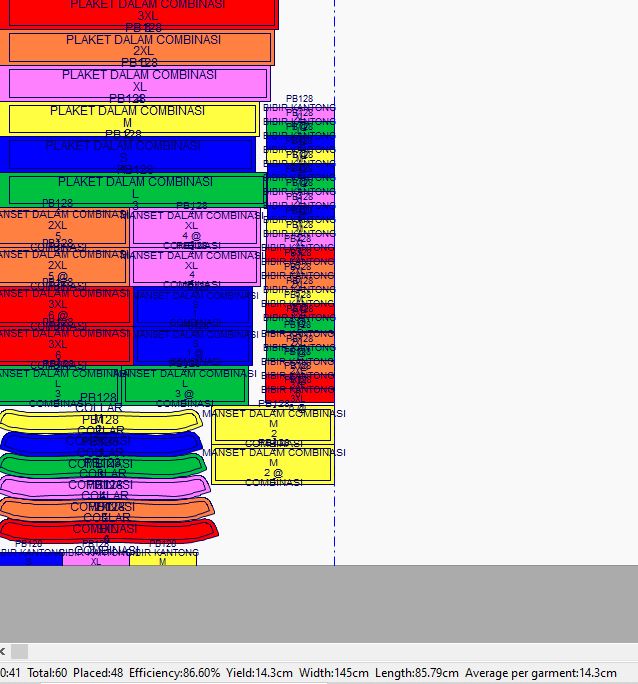 Pada contoh ini marker penggunaan bahan kain yang paling efisien dengan menggunakan 6 gambar pola (ukuran: XS, S, M, L, XL, 2XL) adalah 468cm dengan tingkat efisiensi sebesar 87.96%.