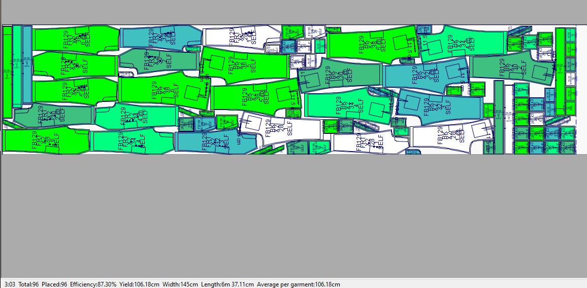 1. Markeran bahan dihasilkan secara otomatis menggunakan algoritma otomatis mengikuti standar industri Internasional untuk mendapatkan penggunaan kain yang paling efisien dengan analisa lebih dari 10,000 markeran pola