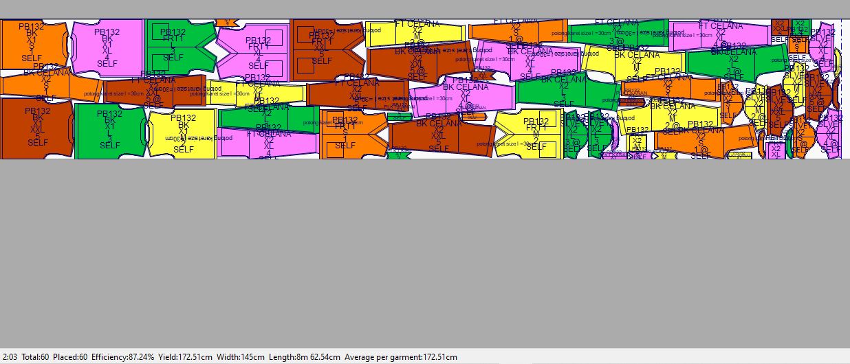 Pada contoh ini marker penggunaan bahan kain yang paling efisien dengan menggunakan 6 gambar pola (ukuran: XS, S, M, L, XL, 2XL) adalah 468cm dengan tingkat efisiensi sebesar 87.96%.