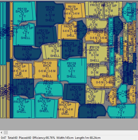 Pada contoh ini marker penggunaan bahan kain yang paling efisien dengan menggunakan 6 gambar pola (ukuran: XS, S, M, L, XL, 2XL) adalah 468cm dengan tingkat efisiensi sebesar 87.96%.