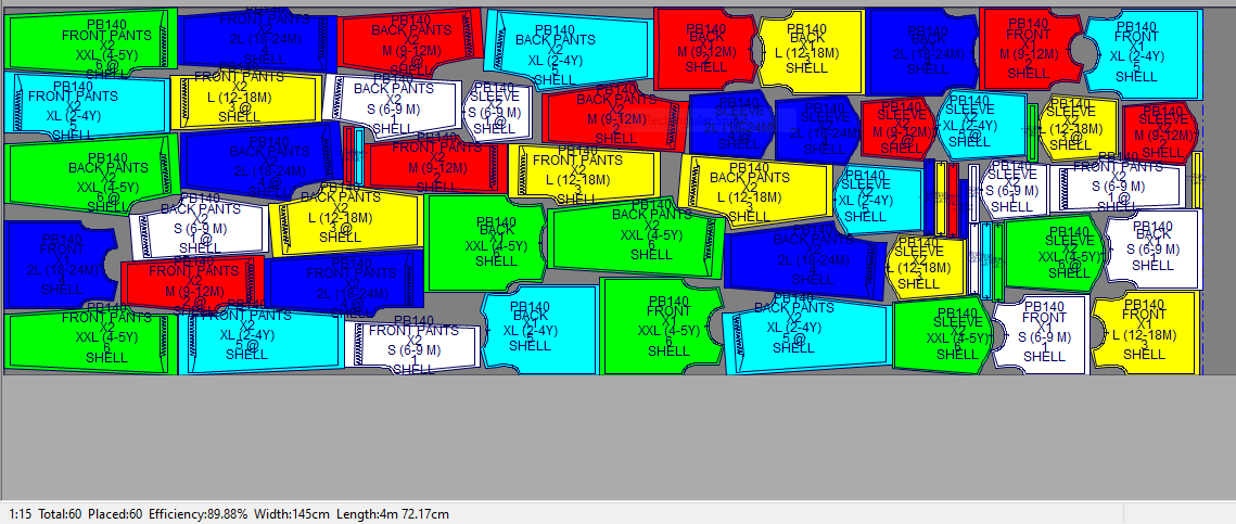 Pada contoh ini marker penggunaan bahan kain yang paling efisien dengan menggunakan 6 gambar pola (ukuran: XS, S, M, L, XL, 2XL) adalah 468cm dengan tingkat efisiensi sebesar 87.96%.