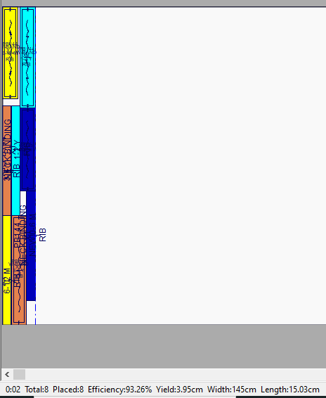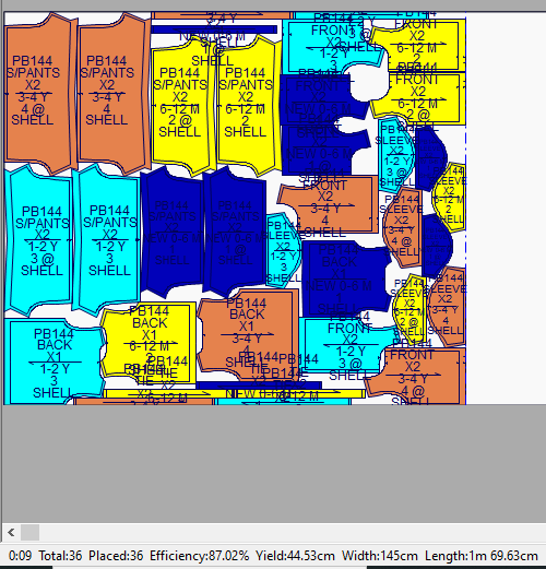 Pada contoh ini marker penggunaan bahan kain yang paling efisien dengan menggunakan 6 gambar pola (ukuran: XS, S, M, L, XL, 2XL) adalah 468cm dengan tingkat efisiensi sebesar 87.96%.