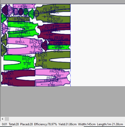 Pada contoh ini marker penggunaan bahan kain yang paling efisien dengan menggunakan 6 gambar pola (ukuran: XS, S, M, L, XL, 2XL) adalah 468cm dengan tingkat efisiensi sebesar 87.96%.