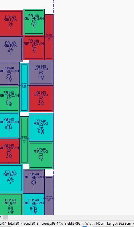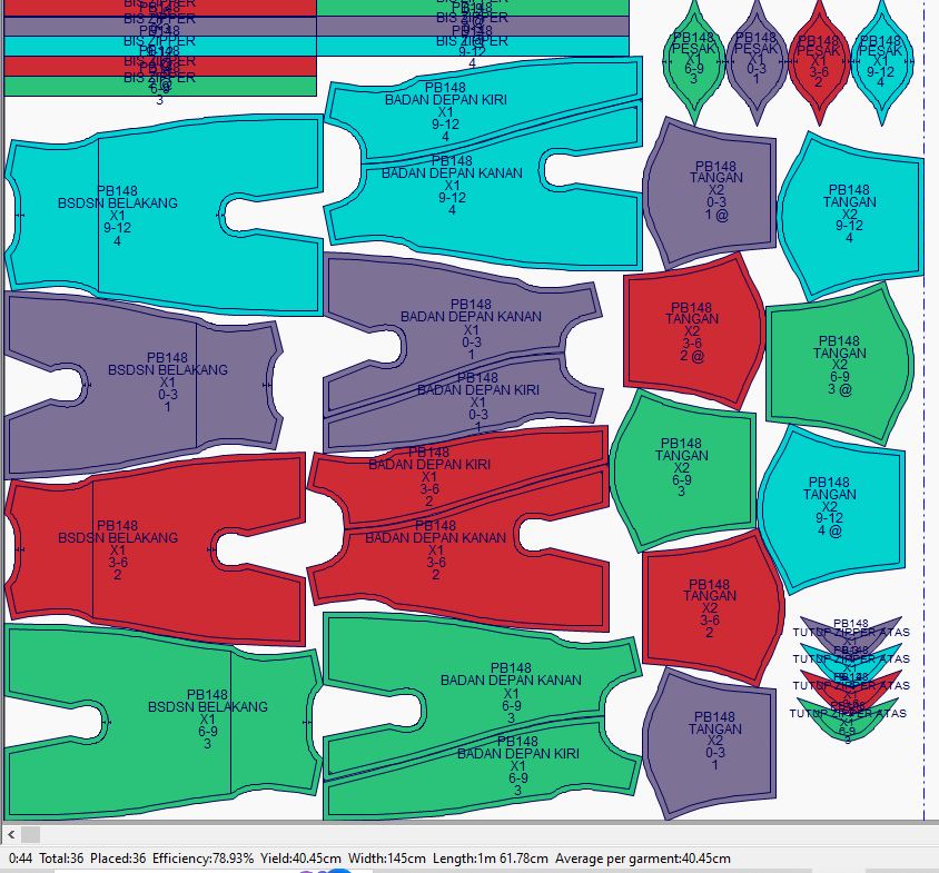 1. Markeran bahan dihasilkan secara otomatis menggunakan algoritma otomatis mengikuti standar industri Internasional untuk mendapatkan penggunaan kain yang paling efisien dengan analisa lebih dari 10,000 markeran pola