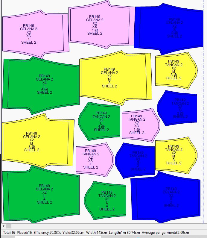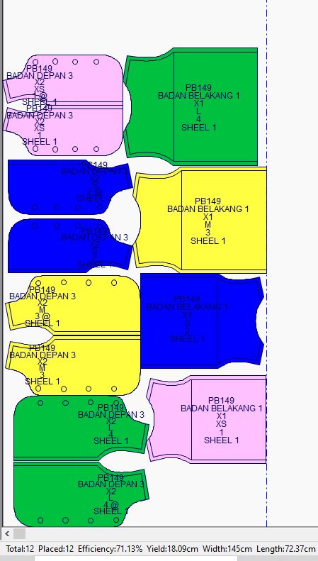 Pada contoh ini marker penggunaan bahan kain yang paling efisien dengan menggunakan 6 gambar pola (ukuran: XS, S, M, L, XL, 2XL) adalah 468cm dengan tingkat efisiensi sebesar 87.96%.