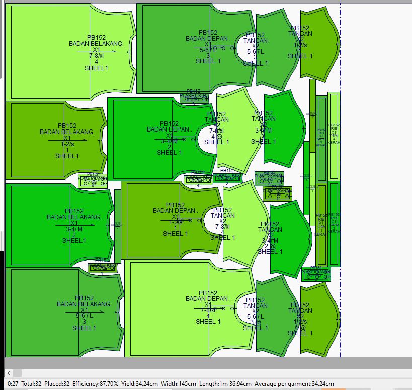 1. Markeran bahan dihasilkan secara otomatis menggunakan algoritma otomatis mengikuti standar industri Internasional untuk mendapatkan penggunaan kain yang paling efisien dengan analisa lebih dari 10,000 markeran pola