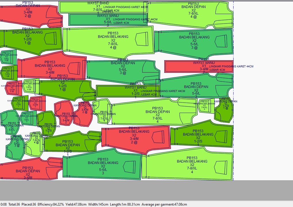 1. Markeran bahan dihasilkan secara otomatis menggunakan algoritma otomatis mengikuti standar industri Internasional untuk mendapatkan penggunaan kain yang paling efisien dengan analisa lebih dari 10,000 markeran pola