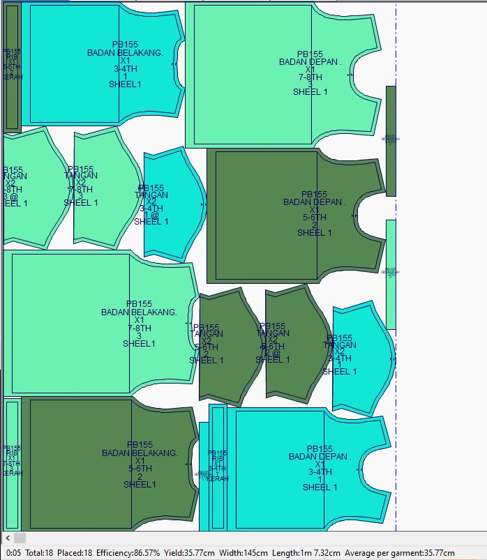 1. Markeran bahan dihasilkan secara otomatis menggunakan algoritma otomatis mengikuti standar industri Internasional untuk mendapatkan penggunaan kain yang paling efisien dengan analisa lebih dari 10,000 markeran pola