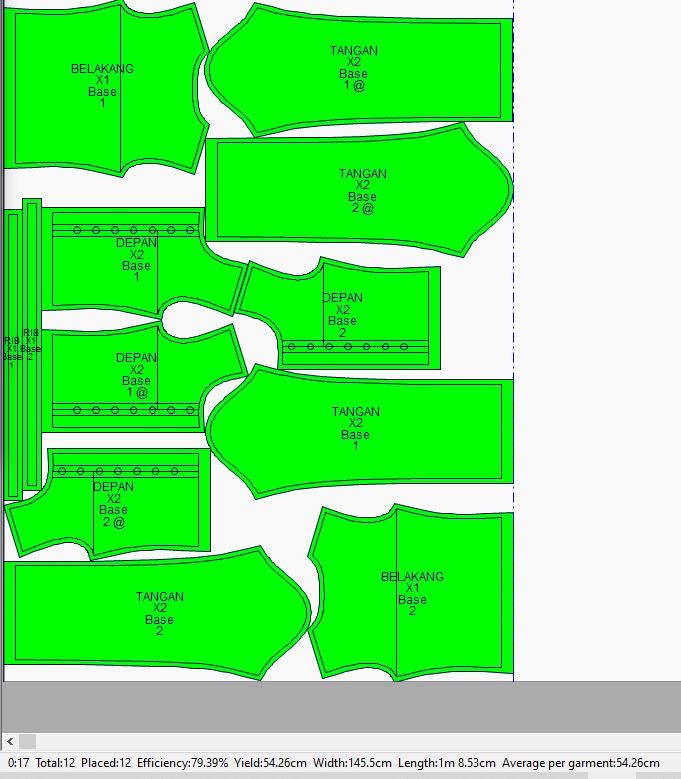 Pada contoh ini marker penggunaan bahan kain yang paling efisien dengan menggunakan 6 gambar pola (ukuran: XS, S, M, L, XL, 2XL) adalah 468cm dengan tingkat efisiensi sebesar 87.96%.