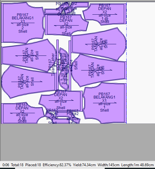 1. Markeran bahan dihasilkan secara otomatis menggunakan algoritma otomatis mengikuti standar industri Internasional untuk mendapatkan penggunaan kain yang paling efisien dengan analisa lebih dari 10,000 markeran pola