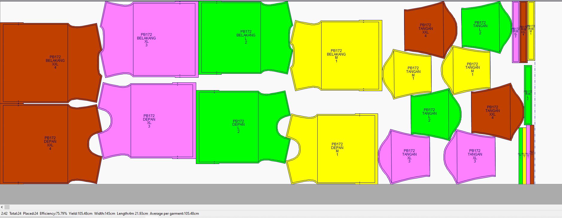 Pada contoh ini marker penggunaan bahan kain yang paling efisien dengan menggunakan 6 gambar pola (ukuran: XS, S, M, L, XL, 2XL) adalah 468cm dengan tingkat efisiensi sebesar 87.96%.