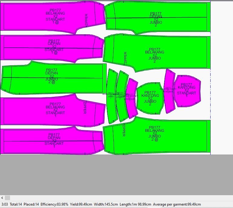 Pada contoh ini marker penggunaan bahan kain yang paling efisien dengan menggunakan 6 gambar pola (ukuran: XS, S, M, L, XL, 2XL) adalah 468cm dengan tingkat efisiensi sebesar 87.96%.