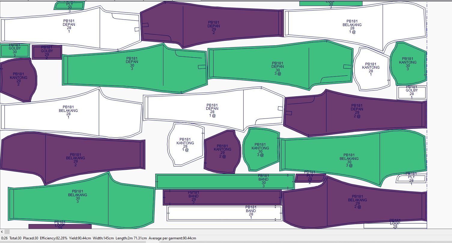 1. Markeran bahan dihasilkan secara otomatis menggunakan algoritma otomatis mengikuti standar industri Internasional untuk mendapatkan penggunaan kain yang paling efisien dengan analisa lebih dari 10,000 markeran pola