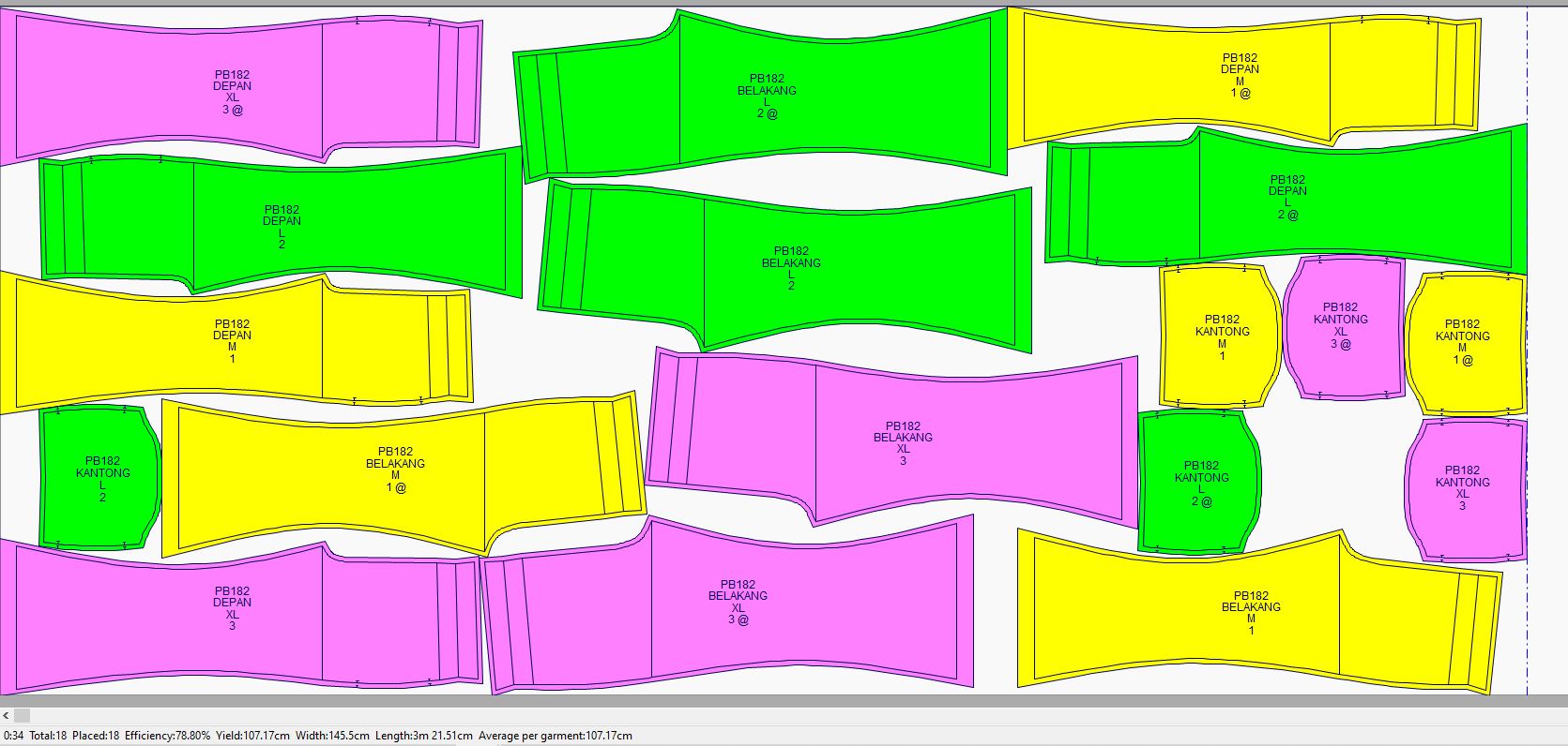 Pada contoh ini marker penggunaan bahan kain yang paling efisien dengan menggunakan 6 gambar pola (ukuran: XS, S, M, L, XL, 2XL) adalah 468cm dengan tingkat efisiensi sebesar 87.96%.