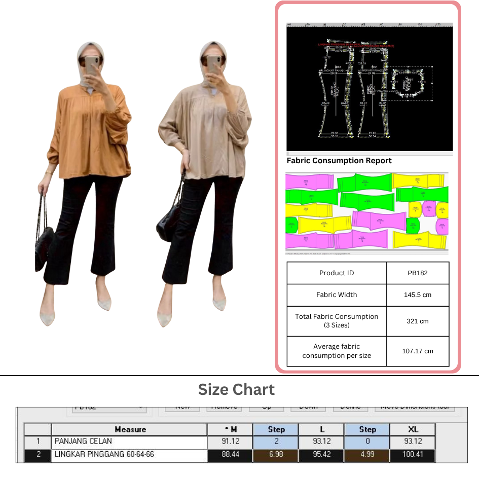 - Rata-rata konsumsi kain per ukuran: 468cm / 6 : 78cm
