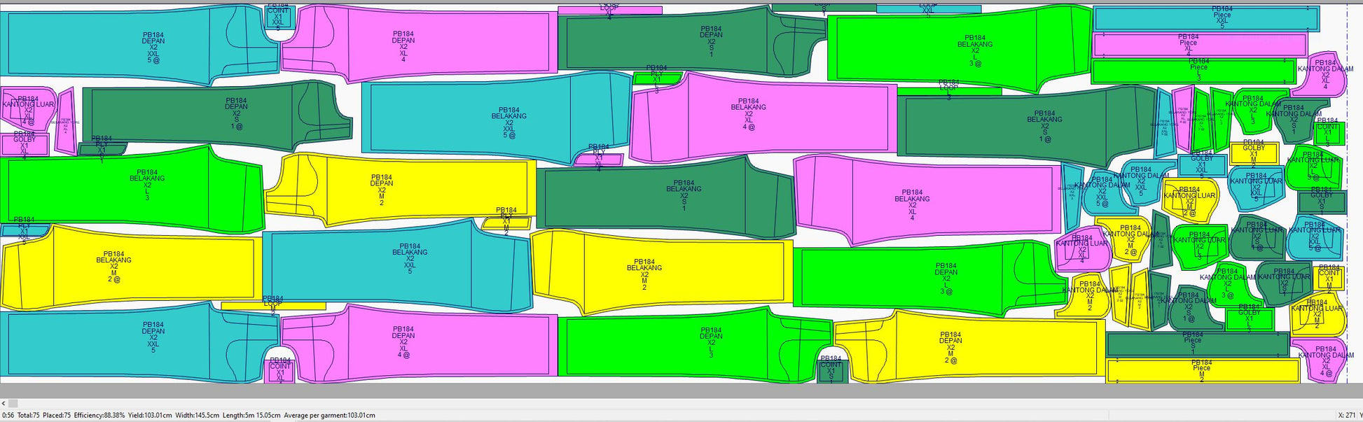 Pada contoh ini marker penggunaan bahan kain yang paling efisien dengan menggunakan 6 gambar pola (ukuran: XS, S, M, L, XL, 2XL) adalah 468cm dengan tingkat efisiensi sebesar 87.96%.