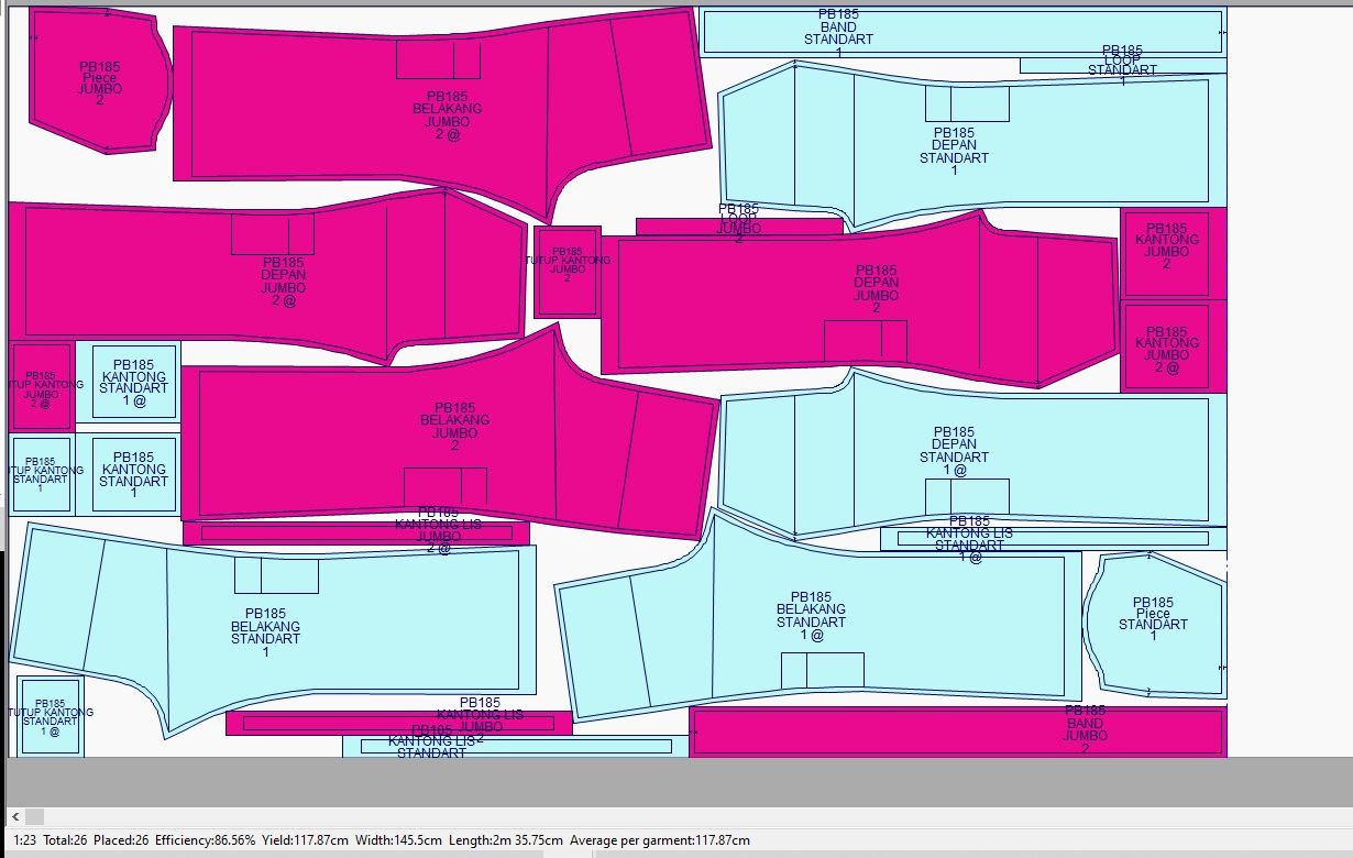 1. Markeran bahan dihasilkan secara otomatis menggunakan algoritma otomatis mengikuti standar industri Internasional untuk mendapatkan penggunaan kain yang paling efisien dengan analisa lebih dari 10,000 markeran pola