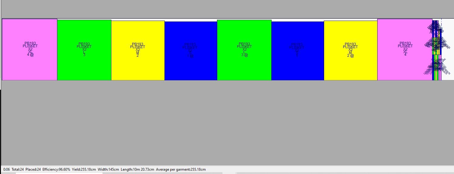 Pada contoh ini marker penggunaan bahan kain yang paling efisien dengan menggunakan 6 gambar pola (ukuran: XS, S, M, L, XL, 2XL) adalah 468cm dengan tingkat efisiensi sebesar 87.96%.