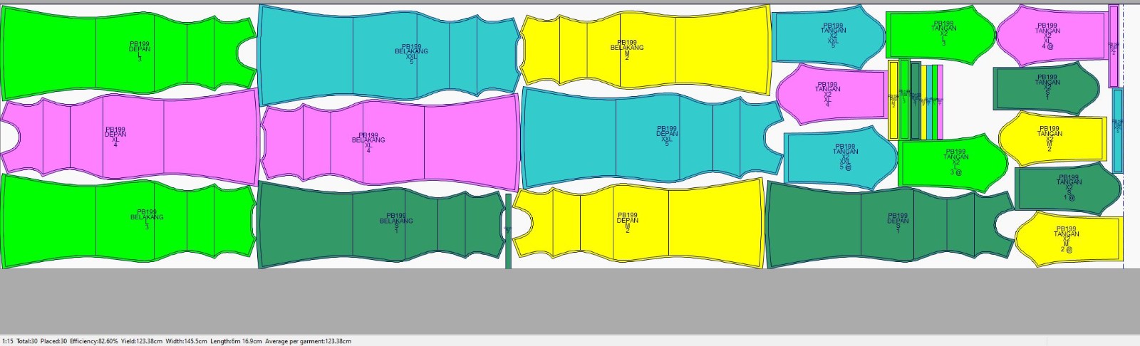 1. Markeran bahan dihasilkan secara otomatis menggunakan algoritma otomatis mengikuti standar industri Internasional untuk mendapatkan penggunaan kain yang paling efisien dengan analisa lebih dari 10,000 markeran pola