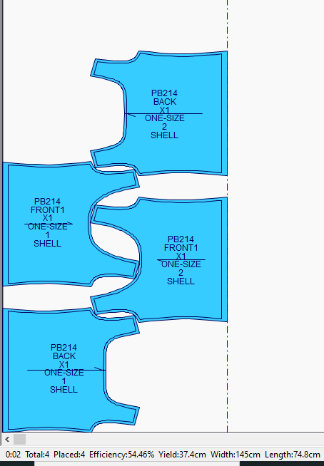 Pada contoh ini marker penggunaan bahan kain yang paling efisien dengan menggunakan 6 gambar pola (ukuran: XS, S, M, L, XL, 2XL) adalah 468cm dengan tingkat efisiensi sebesar 87.96%.