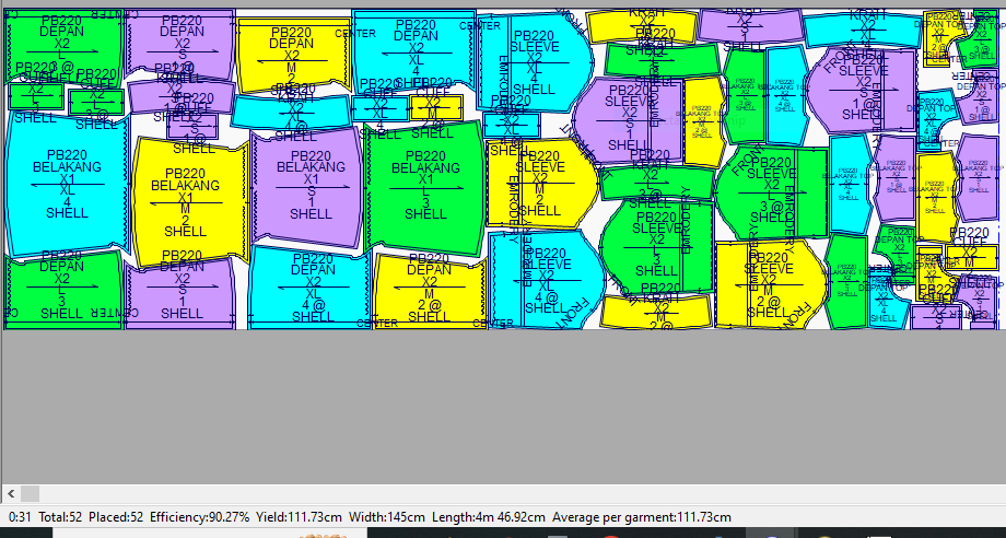 Pada contoh ini marker penggunaan bahan kain yang paling efisien dengan menggunakan 6 gambar pola (ukuran: XS, S, M, L, XL, 2XL) adalah 468cm dengan tingkat efisiensi sebesar 87.96%.