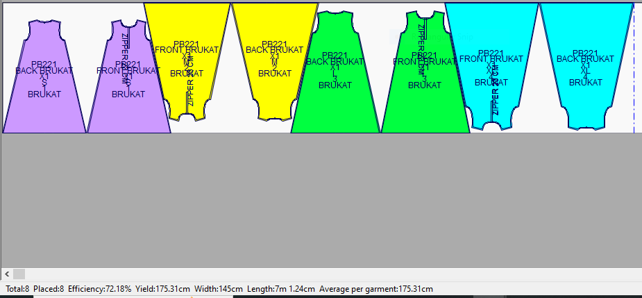 Pada contoh ini marker penggunaan bahan kain yang paling efisien dengan menggunakan 6 gambar pola (ukuran: XS, S, M, L, XL, 2XL) adalah 468cm dengan tingkat efisiensi sebesar 87.96%.