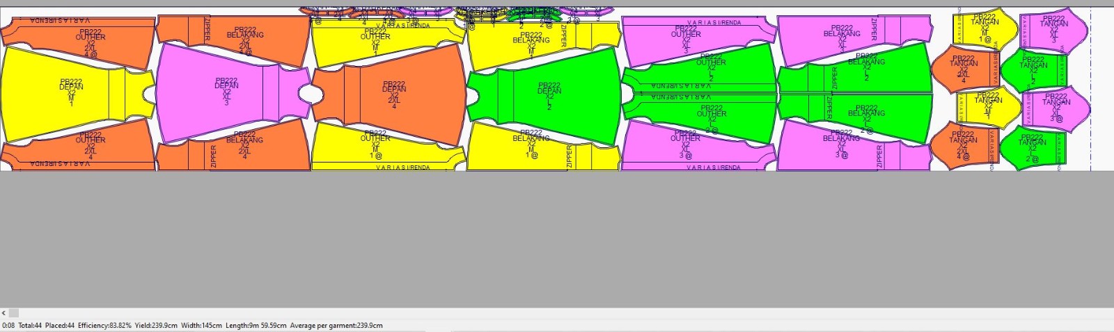 1. Markeran bahan dihasilkan secara otomatis menggunakan algoritma otomatis mengikuti standar industri Internasional untuk mendapatkan penggunaan kain yang paling efisien dengan analisa lebih dari 10,000 markeran pola