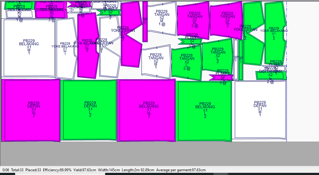 1. Markeran bahan dihasilkan secara otomatis menggunakan algoritma otomatis mengikuti standar industri Internasional untuk mendapatkan penggunaan kain yang paling efisien dengan analisa lebih dari 10,000 markeran pola